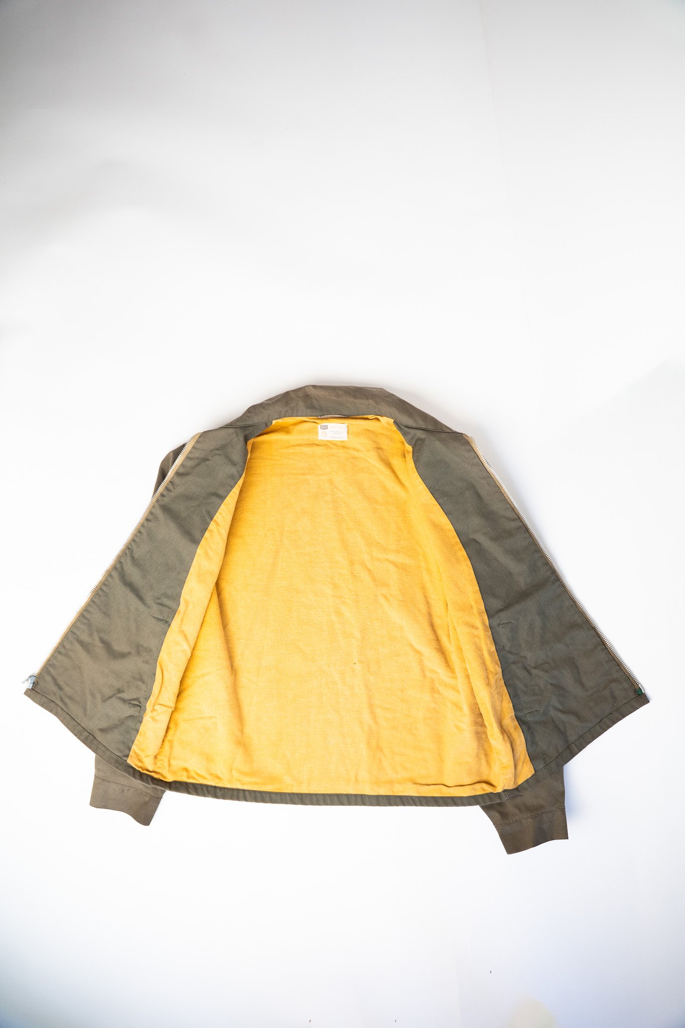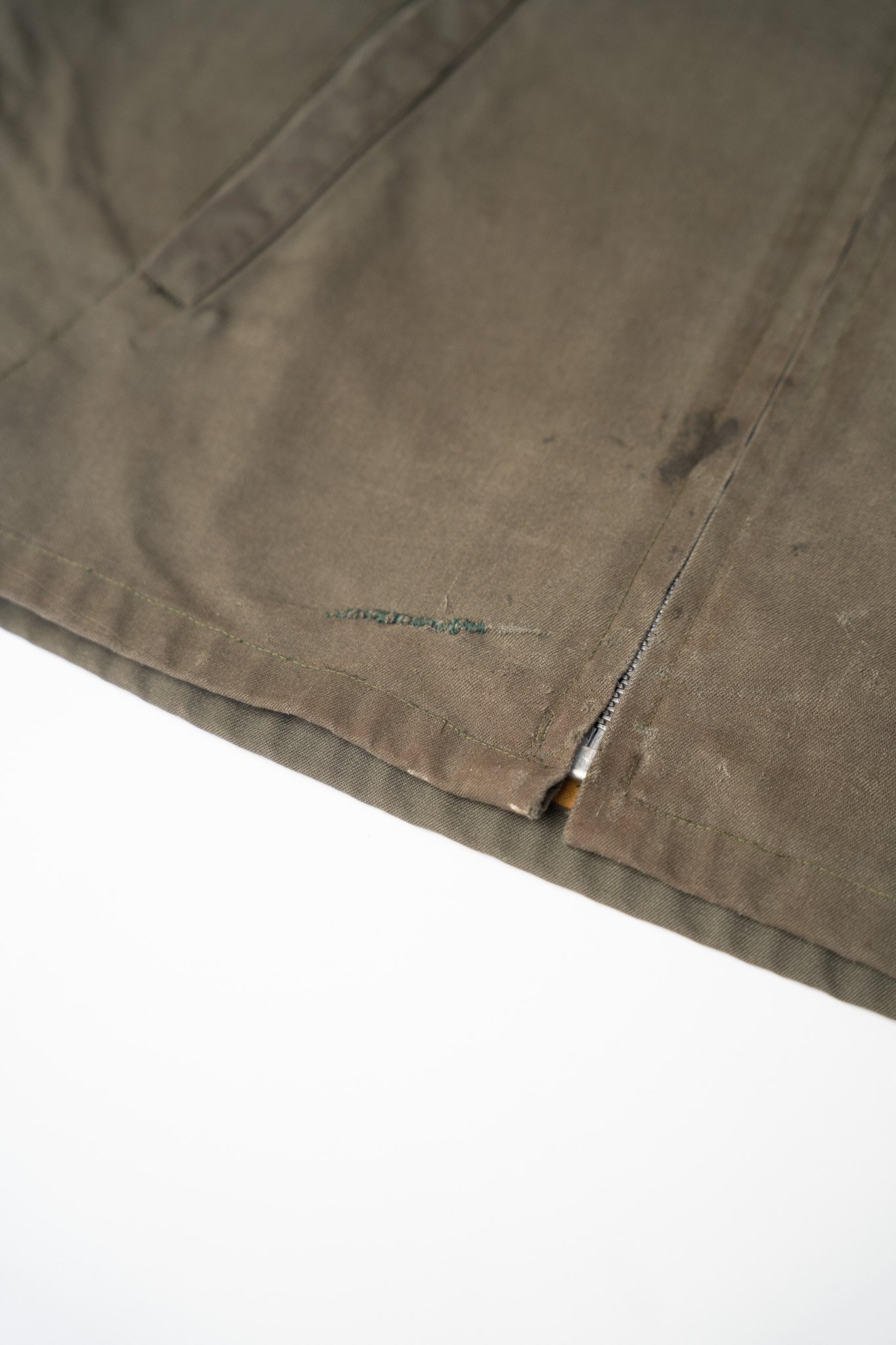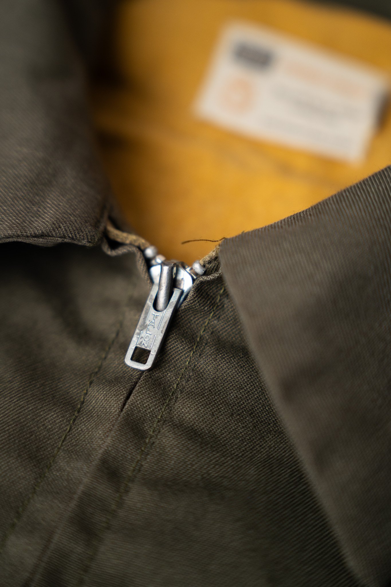 A classic 1960s-era jacket in an olive green tone with a subtle brown undertone, cut from a dry, structured fabric that gives it a timeless feel. The interior features a pristine lining with lightweight chamois cloth for comfort, while a vintage Talon zipper anchors the piece with authentic period hardware. Finished with two front pockets and button cuffs, the jacket shows light, honest wear and subtle original repairs that speak to its history. A beautifully preserved vintage garment with character and enduring style.
