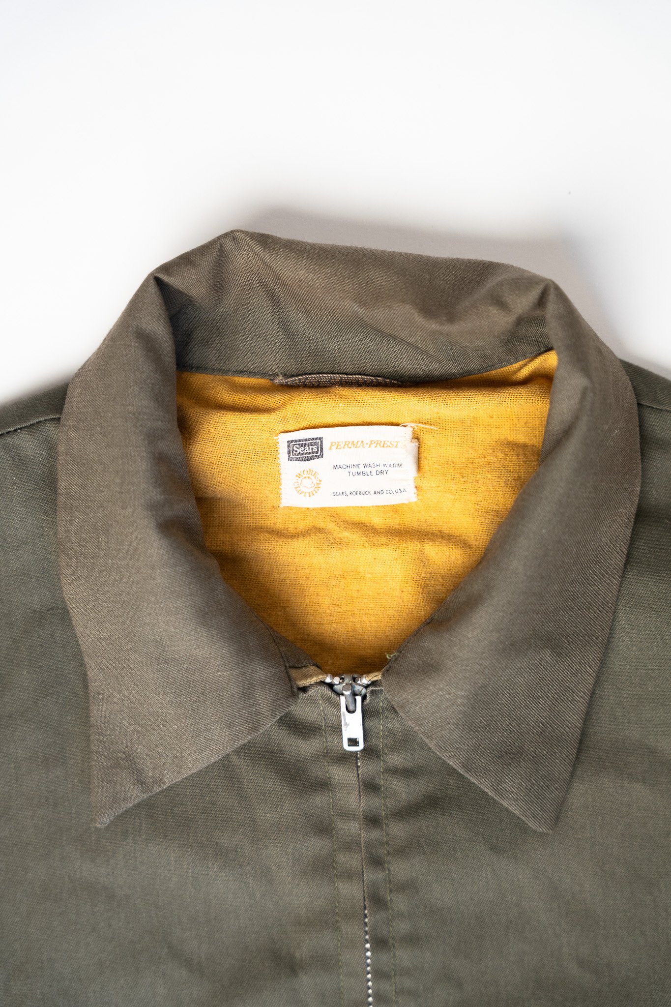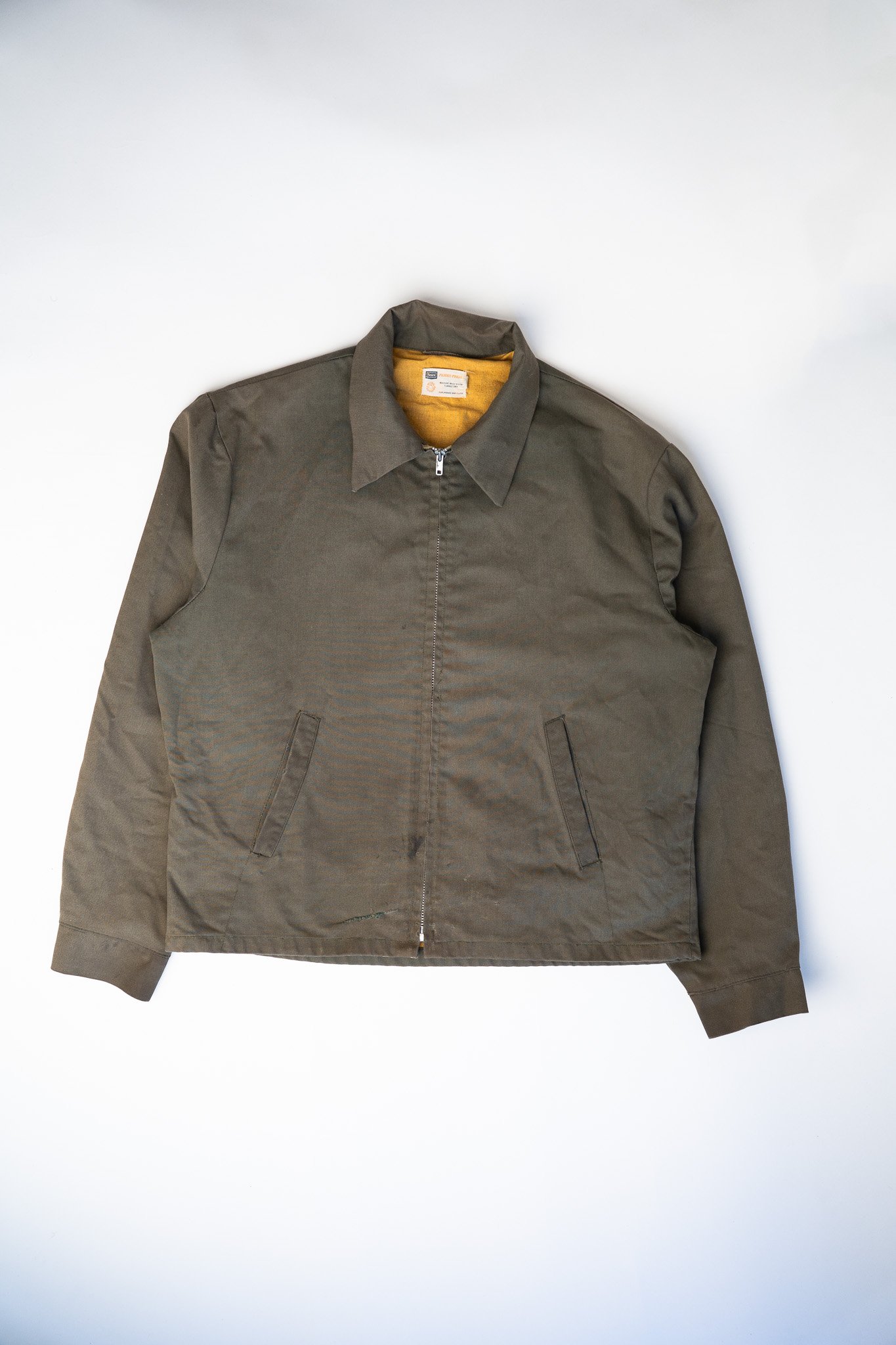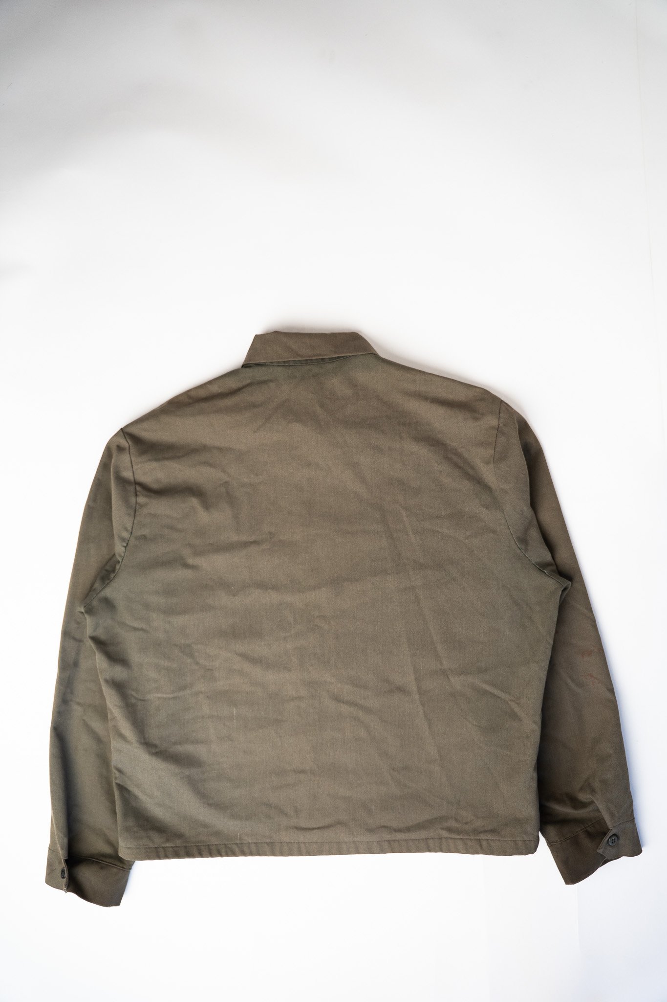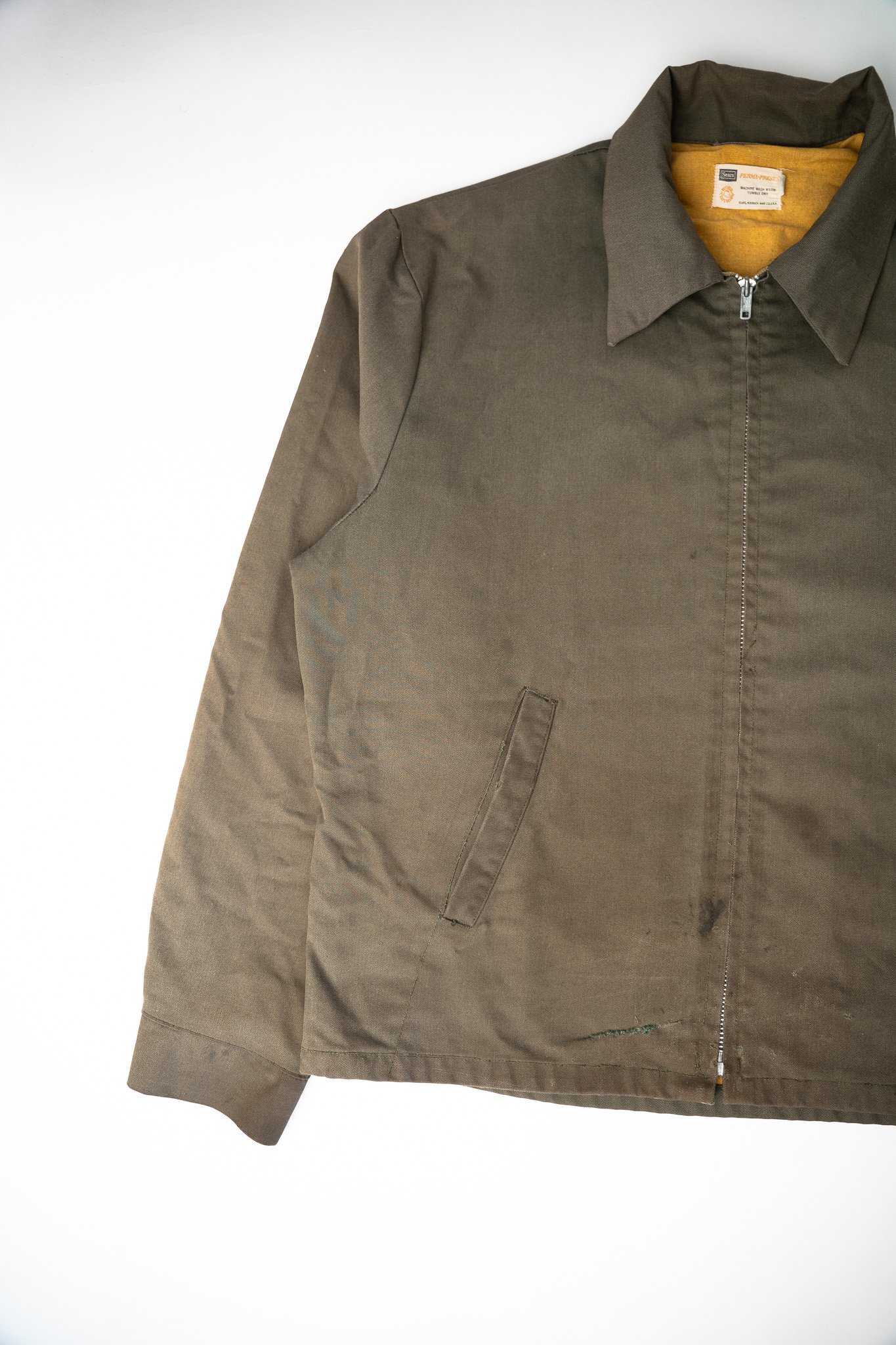 A classic 1960s-era jacket in an olive green tone with a subtle brown undertone, cut from a dry, structured fabric that gives it a timeless feel. The interior features a pristine lining with lightweight chamois cloth for comfort, while a vintage Talon zipper anchors the piece with authentic period hardware. Finished with two front pockets and button cuffs, the jacket shows light, honest wear and subtle original repairs that speak to its history. A beautifully preserved vintage garment with character and enduring style.